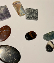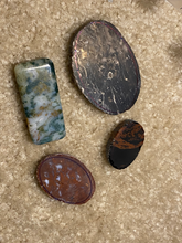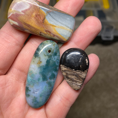 I drilled a hole in the moss cab because I think it will make a nice little pendant. The desert jasper is so pretty with the colors and the petrified wood is so cool.